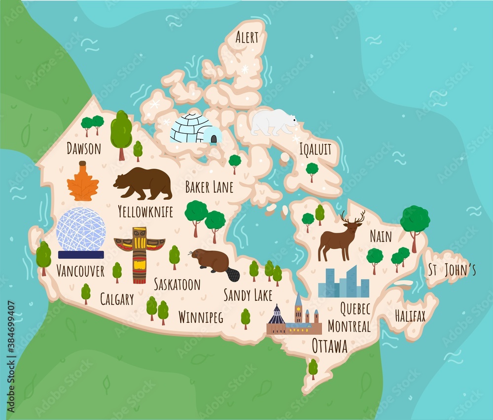 Cartoon map of Canada. Travel illustration with canadian landmarks